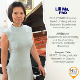 KY INBRE’s weekly newsletter series introduces the 2022 KY INBRE funding recipients. This week, meet Dr. Lili Ma, Northern Kentucky University, recipient of a KY INBRE CUREs award: “The Undergraduate Research in Organic Chemistry Course (UROCC) at NKU utilizes Course-based Undergraduate Research Experiences (CURE) model. While the UROCC experience has organic chemistry at its core, students are also exposed to the research in biochemical and medicinal chemistry fields. The funding from KY INBRE provides support to pilot and implement this course at NKU.”