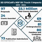 SD EPSCoR is celebrating year-two results from its NSF RII Track-1 project, 2D Best. The project year has brought many successes within science and technology research in the state. Participating in SD EPSCoR research are 69 faculty, 81 undergraduate students and 80 postdocs and graduate students. Project participants submitted 97 proposals and received 24 awards, totaling $5.1M. Research results have been described in 73 articles submitted for publication.
